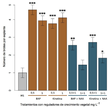 El mejor rango de proliferación, 4-5 brotes/explante se obtuvo en medio de cultivo MS con citoquininas (figura 1). Respecto al tratamiento control, los tratamientos que mejoraron la producción de brotes con mayor significancia son medio de cultivo MS con 0.5 mg-L-1 o 1 mg-L-1 de Kinetina o BAP y en medio de cultivo MS con la combinación de 0,5 mg-L-1 de Kinetina y 1 mg-L-1 ANA (figura 1 ).