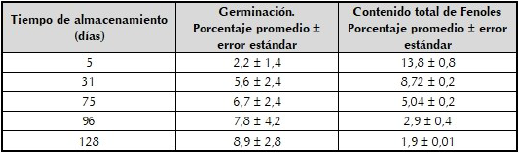 Se evaluaron cinco periodos de almacenamiento: 5, 31, 75, 96, 128 días. Al final de cada periodo se determinó el contenido de fenoles totales y el porcentaje de germinación de las semillas.