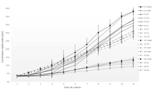 Adicionalmente se evidencia que para H. tessulatus y F. velutipes a partir del día 7, hay un cambio en la tendencia que hasta ese momento tenía el primero de ellos de presentar el mayor crecimiento radial, siendo finalmente la F. velutipes el hongo que mayor crecimiento tuvo indistintamente de la fuente de nutrientes.