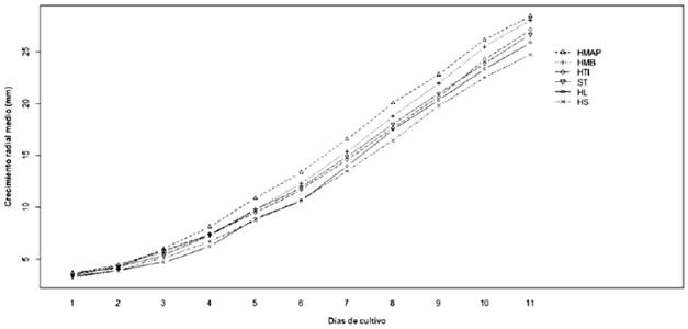 Figura 2: Efecto de la fuente de nutrientes sobre el crecimiento radial medio. HL (Linaza), HMAP (harina de maíz amarillo pre-cocido), HMB (harina maíz blanco), HS (harina de soya), HTI (harina de trigo integral) y ST (salvado de trigo). n = 3