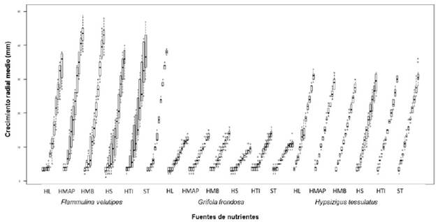 En cuanto al efecto de la fuente de nutrientes sobre el crecimiento radial de cada organismo, del análisis de la figura 1 se evidencia un efecto diferenciado, dependiente de la especie cultivada, ratificando el resultado discutido anteriormente, el cual es similar al obtenido por Zăgrean et al. (2016), donde incluso cuatro diferentes cepas de Pleurotus eryngii, cultivadas en el mismo medio, presentaron diferencias en el crecimiento.