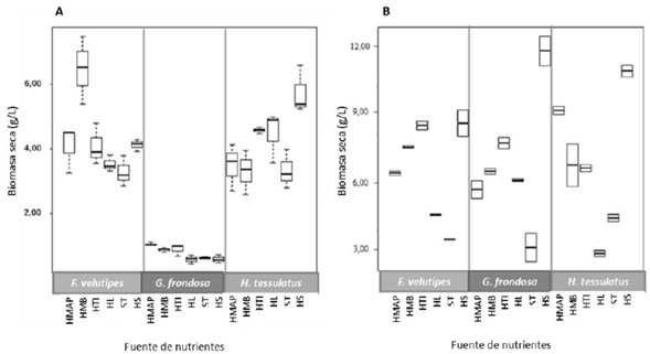 La cantidad de biomasa obtenida se muestra en la figura 4A y de su análisis se puede evidenciar que G. frondosa, independiente de la fuente de nutrientes, es la especie de menor producción, concordante con el crecimiento radial antes analizado. Las fuentes de nutrientes de mayor producción son harina de maíz blanco para F. velutipes (HMB.FV) y harina de soya para H. tessulatus (SY.HT). Para los demás casos no hay un comportamiento diferente. De igual forma es importante resaltar que en fermentación superficial y para las especies estudiadas, la producción de biomasa no presenta un patrón dependiente de la fuente de nutrientes.