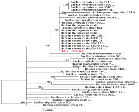 En la figura anterior se observa la relación entre la cepa M1 105 (código en el árbol: 18-1 (reversed)) y B. toyonensis, B. thuringiensis, y B. cereus. En la base de cada clado se muestra el soporte de rama (bootstrap), expresado como el porcentaje de veces en que el análisis produjo la misma asociación entre las secuencias. Este árbol fue construido a partir de las 40 secuencias tipo de microorganismos cultivables más cercanas (Neighbor joining y Bootstrap 100), disponibles en la base de datos de Refseq NCBI, muestra que la secuencia problema se agrupa con las especies B. toyonensis, B. thuringiensis, y B. cereus. De acuerdo con los resultados de búsquedas en las distintas bases de datos, el aislamiento M1 105 pertenece al grupo de B. cereus este es un grupo de bacterias Gram-positivos, formadores de esporas, el cual constituye una rama independiente homogénea dentro de B. genus, compuesto entre otras especies por B. thuringiensis, B. anthracis y B. toyonensis (Sacchi et al., 2002; Jiménez et al., 2013). Estas especies tienen alto grado de similitud a nivel del gen ribosomal 16S, por lo tanto, para poder discriminar entre ellas, es necesario usar regiones específicas de otros genes menos conservados.