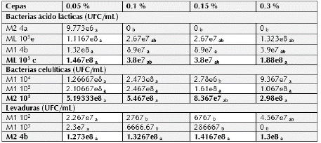 De las cepas seleccionadas como microorganismos con potencial pro biótico respecto a las BAL sólo la M2 4a no presentó tolerancia ante altas concentraciones, las otras cepas tuvieron igual comportamiento. En cuanto a bacterias celulolíticas la cepa M2 105 tuvo mayor resistencia ante las diferentes concentraciones de sales biliares y para las levaduras la cepa M2 4b mostró igual resistencia para las diferentes concentraciones analizadas (tabla 2).