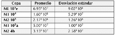 Todas las cepas presentaron crecimiento a temperatura de 40 °C, siendo las cepas M2 105 y M1104 las que mostraron los mayores valores en población, el resto también creció, pero con valores menores.