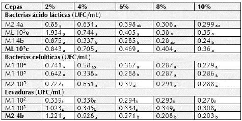 En la tabla 4 se presentan los resultados de los microorganismos seleccionados enfrentados a concentraciones altas de cloruro de sodio. Se observó un efecto significativo en el crecimiento de los diferentes microorganismos a las concentraciones de 2 y 4% de NaCl, sin embargo, a la concentración de 8 y 10% hubo una disminución (tabla 4). Las cepas que mostraron mayor resistencia a altas concentraciones de sal fueron los aislados de bacterias BAL seguido por la bacteria celulolítica y la levadura.