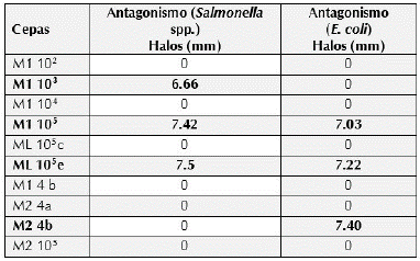 La prueba de antagonismo frente a patógenos, Los microorganismos aislados presentaron poca actividad antagónica frente a E. coli y Salmonella, con excepción de M1 105 y ML 105e (tabla 5).