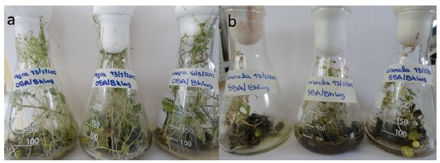 Fig. 1: (a) Vitroplantas de AN cultivadas en MS suplementado con GA, sin BA y bajo condiciones fotoperiódicas; (b) Vitroplantas de G cultivadas en MS suplementado con 5 mg/L de BA, sin GA, bajo condiciones fotoperiódicas.