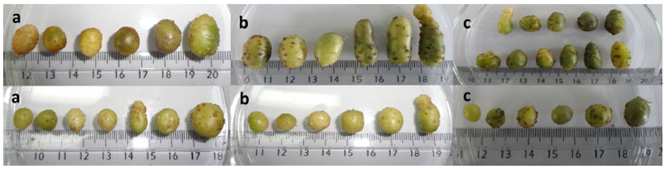 Fig. 2: Microtubérculos de G (arriba) y AN (abajo), incubados bajo condiciones fotoperiódicas, cosechados de vitroplantas pre-tratadas con GA y subcultivadas en MS suplementado con BA: (a) 0 mg/L, (b) 1 mg/L, (c) 5 mg/L.