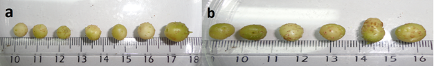 Los microtubérculos producidos por las vitroplantas de las dos variedades, bajo condiciones de fotoperiodo y sin la adición de GA, mostraron una coloración verdosa amarillenta con pocas yemas (Fig. 3), mientras que los microtubérculos obtenidos bajo luz blanca continua mostraron una coloración amarillenta y sin yemas en su superficie.