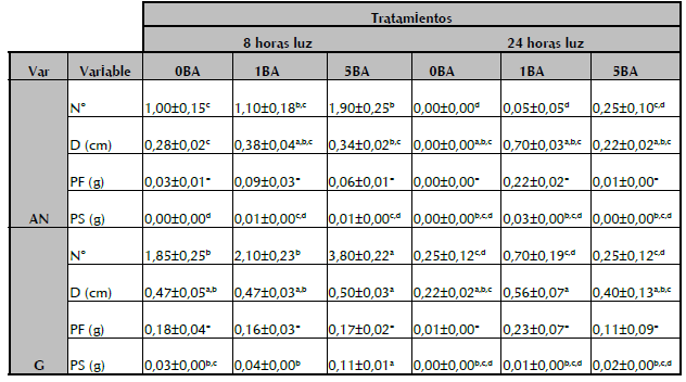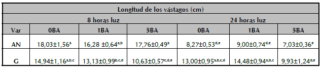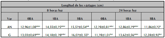 Efecto de la GA sobre el alargamiento del vástago: Las plantas de la variedad AN mostraron la mayor longitud de los vástagos cuando fueron cultivadas en MS líquido suplementado con GA, sin BA y bajo condiciones fotoperiódicas (Tabla 1, Fig. 1); por otra parte las plantas de la variedad G mostraron la mayor longitud de los vástagos cuando fueron cultivadas en MS líquido suplementado con 5 mg/L de BA y sin GA, bajo condiciones de fotoperiodo (Tabla 2, Fig. 1), luego de tres meses de cultivo.
