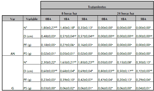 Efecto de la BA y del fotoperiodo sobre la producción de microtubérculos: Se evaluó la interacción entre el tratamiento previo con GA y el subcultivo de estas plantas en medios de cultivo líquidos suplementados con tres concentraciones de BA (0, 1 y 5 mg/L) e incubadas bajo diferentes regímenes lumínicos (Tabla 3). La variedad AN produjo el mayor número de microtubérculos (1.80) y de mayor diámetro, en medio MS líquido sin BA, bajo condiciones fotoperiódicas. No hubo diferencias estadísticamente significativas para el peso fresco y peso seco de los microtubérculos. La incubación bajo luz blanca continua no produjo la formación de microtubérculos en las vitroplantas de esta variedad.