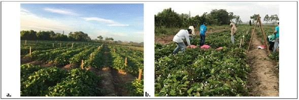 Las plantas in vitro previamente endurecidas fueron establecidas en campo (Figura 1a y 1b) bajo un diseño completamente aleatorizado con ocho tratamientos y tres repeticiones. Los tratamientos evaluados fueron los siguientes: T1: T. absoluto (Sin inoculación, sin fertilización), T2: T. químico (sin inoculación, 100%FM), T3: IBVS2 + 50%, T4: IBVS2 + 75%FM, T5: IBVS13 + 50% FM, T6: IBVS13 + 75%FM, T7: IBVS2 +IBVS13 + 50%FM T8: IBVS2+IBVS13+75%FM. El tamaño de parcela o unidad experimental constaba de cinco surcos de 7,2 m de largo y una distancia de 1 m entre surco con una densidad de siembra 0,4 m, para un total de 2,160 plantas.