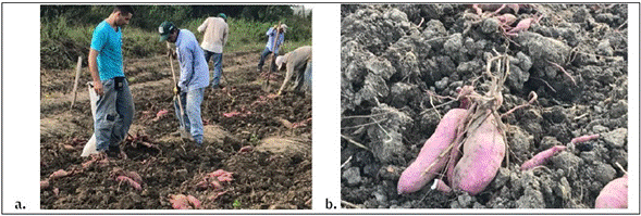 Figura 2: Cosecha del cultivo de batata variedad criolla de la Pozona establecido en Centro de Investigación Turipana en la microrregión del valle del Sinú a. Cosecha de batata b. Raices Tuberosas de batata ( Azotobacter vinelandii más el 75% de fertilización)