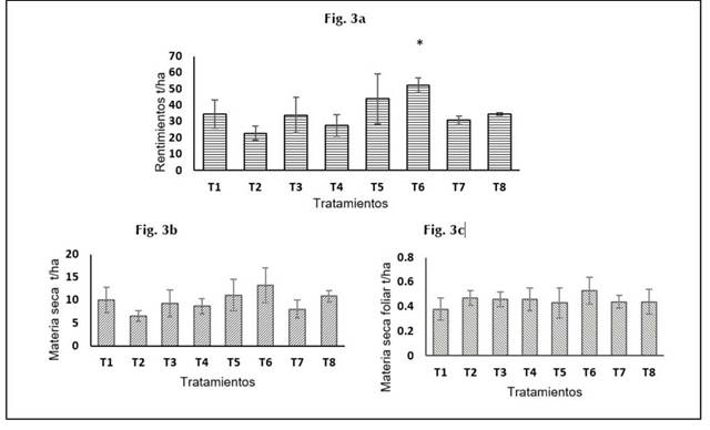 En la Figura 3a, se observan los resultados obtenidos para la variable rendimiento de raíces frescas. El tratamiento T6 presentó diferencias estadísticamente significativas (p< 0,05) con T2 y respecto a T1 aunque no presentó diferencias significativas se obtuvo un mayor valor medio de rendimiento (Figura 1a).