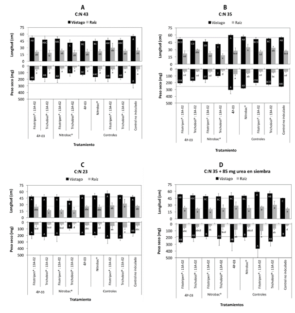 Figura 1: Longitud (panel superior) y peso seco (panel inferior) de vástago y raíz de plántulas de arroz variedad F60 desarrolladas en sustrato TA/suelo bajo diferentes proporciones C:N e inoculantes biológicos. La línea solida negra y punteada gris indican la media del control experimental respectivo (TA no inoculado). (A) C:N 43; (B) C:N 35; (C) C:N 23; (D) C:N 35 + 85 mg urea aplicados al momento de la siembra. Las barras indican la desviación estándar del promedio de cinco replicas experimentales. Letras con el mismo valor indican ausencia de diferencias significativas según prueba de Duncan p>0.05. Las variables no paramétricas, peso raiz C:N 43 y peso vástago C:N 35, fueron analizadas con la prueba de Kruskall-Wallis y comparación de medias estudentizada de Tukey α=0.05.