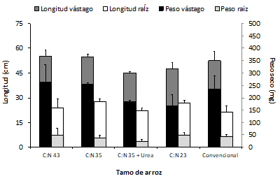 El análisis comparativo de los controles experimentales no inoculados bajo cada relación C:N, respecto al manejo convencional (figura 2), sugiere que la no adición de N al sistema (C:N 43), mantiene el crecimiento vegetal en presencia de la incorporación de TA al suelo. Este resultado se evidencia por los valores de 55.0 cm y 23.8 cm para longitud de vástago y raíz, y 263.8 mg y 47,8 mg para peso seco de vástago y raíz, respectivamente, bajo la relación C:N 43, en comparación con el tratamiento convencional (aplicación de una dosis equivalente a 150 kg N. ha-1 al momento de la siembra, sin la incorporación de tamo de arroz), cuyo tratamiento presentó valores de 52.4 cm, 21.3 cm, 233.0 mg y 44.0 mg para para longitud y peso seco de vástago y raíz, respectivamente (figura 2). Estos resultados muestran que la incorporación de TA sin adición de enmiendas, permite mantener una tasa de crecimiento vegetal durante los primeros 40 días de cultivo, lo que sugiere que hay un reciclaje de nutrientes que pueden ser asimilados por la planta, producto de la actividad enzimática presente en las comunidades microbianas “autóctonas” de residuos agrícolas como el TA (Simmons et al., 2014). De hecho, se ha reportado ampliamente que estas comunidades microbianas pueden liberar nutrientes a partir de la producción de complejos multienzimáticos complementarios que permiten degradar los residuos lignocelulósicos eficientemente (Cragg et al., 2015; Jiménez et al., 2017). En este contexto, autores como Mandal et al., (2004), han encontrado que la adición de 10 ton ha-1 de TA al suelo, 4-5 semanas previas al trasplante de las plántulas, equivale a la aplicación basal de 40 Kg ha-1 N en forma de urea, aumentando los niveles de NO3 en 46%, la captura de N en 29% y la productividad de arroz en 37 %, respecto de las quemas del residuo de cosecha a campo abierto.