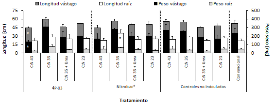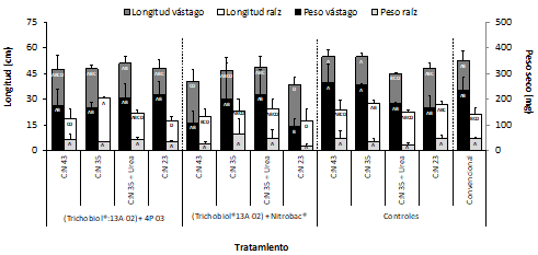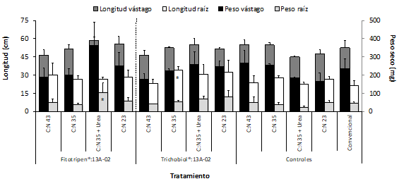 Por otra parte, el empleo del consorcio Trichobiol®:IBUN13A-02 con cada uno de las BPCVs, produjo reducciones en la mayoría de las variables evaluadas en las proporciones C:N 43, C:N 35 y C:N 23, en comparación con los controles respectivos (figura 6). El empleo conjunto del consorcio Trichobiol®:IBUN13A-02 con la BPCV Nitrobac® en ausencia de urea (C:N 43), generó reducciones significativas en longitud de vástago de 22.5 %, así como 53.9 % y 46.6 % en peso seco de vástago y raíz, respectivamente, en comparación con el tratamiento convencional. Resultados similares se obtuvieron para los mismos bioinoculantes bajo una relación C:N 23, correspondiente a la máxima dosis de urea adicionada al sistema (figura 6). En contraste, la aplicación del consorcio Trichobiol®:IBUN13A-02 con la BPCV IBUN4P-03 bajo la proporción C:N 35 fue el único tratamiento en mostrar aumento significativo en longitud de raíz, del orden de 43.1 %, respecto a la práctica convencional de fertilización (figura 6).