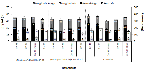 La aplicación conjunta de consorcios y promotores de crecimiento vegetal no generó incrementos significativos en las variables de crecimiento evaluadas, en comparación con el tratamiento convencional, con excepción del tratamiento Trichobiol®:IBUN13A-02 + BPCV IBUN4P-03 C:N 35, que incrementó la longitud de las raíces de las plántulas en un 42.7% (figura 6). Por otra parte, se pudo evidenciar una disminución significativa en el crecimiento de plántulas sometidas al tratamiento Fitotripen®:IBUN13A-02 + BPCV Nitrobac® bajo las relaciones C:N 35 y 23 en comparación con los controles C:N respectivos, en términos de longitud y peso seco de vástago y longitud de raíz (figura 5). De forma similar, el empleo conjunto del consorcio Fitotripen®:IBUN13A-02 con la BPCV IBUN4P-03 a una dosis C:N 35 + 85 mg de urea, mostró incrementos significativos de 18.4% y 155.5% en longitud de vástago y peso seco de raíz, respectivamente, contra el control C:N correspondiente (figura 5).