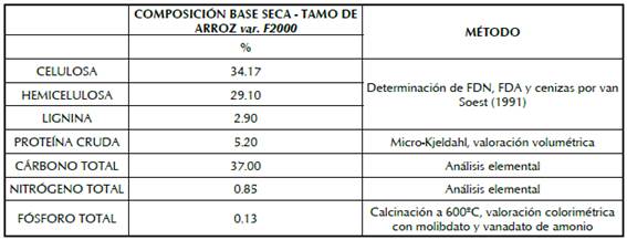 Tabla 1: Composición de carbono, nitrógeno y fosforo del tamo de arroz var. F2000.