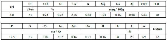 ns: no solicitado pH determinado por el método de suspensión suelo:agua (relación peso: volumen 1:1); CE: conductividad eléctrica; CO: Carbono orgánico oxidable; N: Nitrógeno; Ca: Calcio; K: Potasio; Mg: Magnesio; Na: Sodio; CIC: Capacidad de Intercambio Catiónico; CICE: CIC efectiva; Al: Acidez intercambiable; P: Fosforo disponible; S:Azufre disponible; Cu: Cobre; Fe: hierro; Mn: Manganeso; Zn: Zinc; B: Boro; Ar: Arcilla; L:Limo; A:Limo.