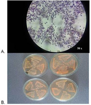 Figura 2: A). Tinción de Gram del aislamiento C1NR, identificado como R. dairenensis. Acercamiento de 50x por Microscopia óptica convencional. B). Aspecto de los aislamientos en medio PDA con gasolina al 1%.