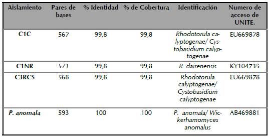 Para los aislamientos seleccionados se obtuvieron productos de PCR del tamaño esperado para la región amplificada (600 pb aproximadamente) (Figura 3). De acuerdo con el análisis de BLAST y la base de datos UNITE, los aislamientos C1C, C1NR y C3RCS pertenecen al género Rhodotoru-la, con un porcentaje de identidad > 99%. En la Tabla 2 se observan los aislamientos con su respectiva identidad, al igual que el número de pares de bases con las cuales fue comparada, y el número de acceso de UNITE.