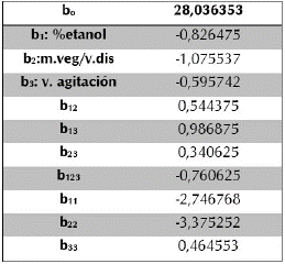 En esta tabla 3 se muestran los efectos estimados de cada uno de los factores sobre la concentración de polifenoles totales presente en el extracto, así como los efectos combinados de dichos factores. Esto permitió observar que los factores %etanol (b1), m.veg/v.dis (b2) y velocidad de agitación (b3), así como las interacciones múltiples b12, b13, b123, b11, b22 presentan efectos significativos sobre la variable respuesta. El efecto de los factores y de las interacciones b123, b11, b22 resultó ser negativo, esto nos indica que para obtener mayor contenido de polifenoles totales resulta conveniente operar con valores bajos de dichos parámetros. En cuanto a las interacciones (b12, b13) podemos observar que influyen de forma positiva, por lo que un aumento de estas provoca el mismo efecto en la concentración de polifenoles totales presentes en el extracto, favoreciendo así el proceso de extracción.
