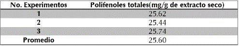 El óptimo contenido de polifenoles totales presentes en el extracto de T. testudinum (25.60 mg/g de extracto seco), se obtiene empleando una relación de 1/11.5 p:v, con 60% de etanol y una velocidad de agitación de 800 r.p.m. Una vez determinado el óptimo de la función se procede a realizar la confirmación experimental, para ello se realizó un experimento bajo las condiciones óptimas con tres réplicas. Los resultados del contenido de polifenoles totales se muestran en la tabla 4.