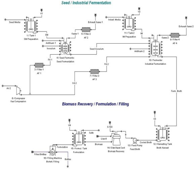 The results obtained in this case study demonstrate that through the implementation of simulation and modeling techniques it's possible to study, analyze and improve processes, while it constitutes a valid and powerful tool to quantify process changes and variations, and also to compare alternative process methods. The results obtained will improve ecological, technical and economical evaluations of the application under study, and also will help to focus the research and optimization approaches towards the most promising directions. the base-case equipment costs, labor, feedstock or utilities. The possibility to compare the results obtained in the modified process with those obtained in the base-case will aid researchers and engineers to analyze, develop or assess novel biofertilizer production processes and technologies.