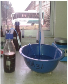 Para el proceso de digestión anaerobia se utilizó un biorreactor anaerobio discontinuo sin agitación, el cual se adaptó a nivel de laboratorio para medir la cantidad de biogás producido. La cuantificación de biogás se permitió gracias a la implementación de la metodología planteada por Reyes (2016), donde el biogás se mide utilizando la técnica de desplazamiento de líquido; la cual consiste en introducir una probeta invertida en un recipiente con una solución salina al 3% (H2O + NaOH) que sirve de purga para el metano, ya que captura el CO2, reacciona con este formando carbonato, y permite el paso y acumulación de CH4, (Sanabria, Durán y Gutiérrez, 2012), dentro de la probeta se colocó una manguera conectada con el reactor para permitir la salida del gas hacia la parte superior, lo que hace que el nivel del agua de la probeta baje debido a la presión que ejerce el gas sobre el líquido, a lo cual se le conoce como principio de Arquímedes (Bernal et al., 2012).