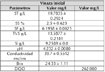 Las vinazas se caracterizaron, analizando parámetros fisicoquímicos que constaron de; medición de pH, conductividad, sólidos totales (ST), sólidos fijos (SF), sólidos insolubles (SI), sólidos disueltos (Brix), sólidos volátiles (TVS), (por duplicado), DQO y DBO; de acuerdo a lo establecido por APHA (2005), y en la NTC 5167.