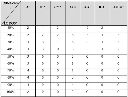A*: Lodos laguna de oxidación y enfriamiento; Β**: Lodos PTAR; C***: Lodos vinaza. 0: no producción. 1: mínima producción. 2: producción baja. 3: producción buena. 4: producción óptima.