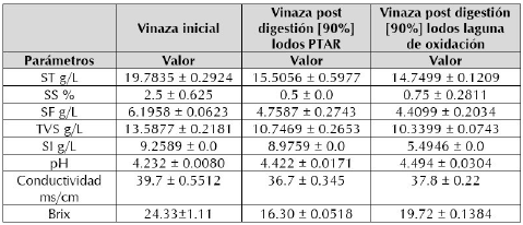 Teniendo en cuenta las dinámicas mencionadas anteriormente, la reducción de volumen de vinaza y la evidencia de mayor producción de biogás en las altas concentraciones de vinaza, se determinó de esta manera que la concentración de 90% de vinaza con inóculo de lodos de la laguna de oxidación y enfriamiento, y la concentración de 90% de vinaza con inóculo de lodos PTAR + Lodos laguna, fueron los ensayos que más se aproximaban a lo esperado; por tanto, se puede decir que los lodos de la laguna de oxidación y enfriamiento contienen microorganismos productores de biogás con mayor adaptabilidad a altas concentraciones de vinaza. Se realizó análisis fisicoquímico a la vinaza final después de la digestión con lodos de mayor rendimiento en producción de biogás (tabla 3), los cuales se compararon con los parámetros medidos a la vinaza inicial.