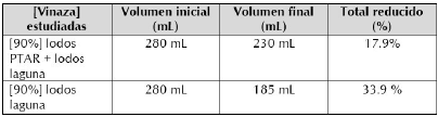 Tabla 4: Porcentaje de reducción del volumen de vinaza después de la digestion (ensayo cualitativo).