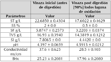Tabla 3: Resultados de los análisis fisicoquímicos de las vinazas antes y después de digestión.