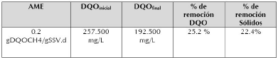 Además de obtener una AME favorable, se produjo también una reducción significativa de carga orgánica, en la tabla 6 se observa el porcentaje de remoción de DQO y sólidos.