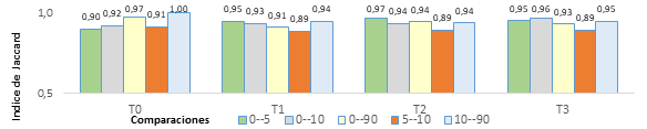 Figura 1: Índices de diversidad Beta, Jaccard por tratamiento a través del tiempo