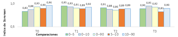 Con relación a la diversidad beta medida en función de Jaccard y Sorensen (figuras 1 y 2), los valores sugirieron mayor variación solo al comparar el tratamiento T0 contra los demás, mostrando rangos que se incrementaron a través del tiempo y expresanron ganancia en la similitud hacia el último muestreo (90 días) y recuperación frente a las condiciones iniciales. En contraste en el caso de los tratamientos donde se aplicó compost (T1, T2 y T3) la tendencia de estos índices, a través del tiempo, fue decreciente con el aumento de la dosis, indicando que las poblaciones fueron más disimiles en T3 y al final del periodo.