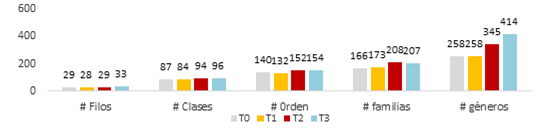 En la figura 3 se observa el incremento en el número de unidades identificadas en la medida en que aumenta la especificidad bacteriana. De igual manera, al comparar el número de OTUS por tratamiento, se observa que en todas las categorías taxonómicas se incrementó el número con respecto a T0, especialmente en T2 (dosis normal) y T3 (doble dosis) con diferencia del 30% entre estos dos, en favor del tratamiento T3.