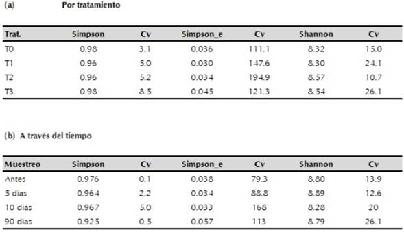 Tabla 1:: Índices de diversidad alpha por tratamiento (a) y a través del tiempo (b).