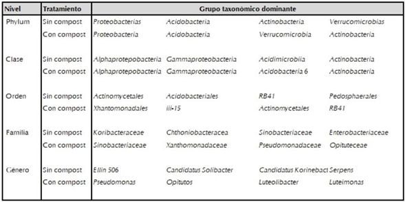 Al comparar los grupos dominantes existentes en las muestras sin aplicación y con aplicación de compost se observa en la tabla 2 que se conserva una estructura muy parecida a nivel de phylum y clase, sin embargo, la composición bacteriana y su distribución cambian desde el nivel de orden posiblemente por efecto de la aplicación de compost, hasta el punto de que ningún género coincide, posiblemente debido a la presencia de poblaciones zimógenas (Gómez, Paulini y Hernández, 2010)
