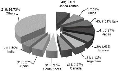 Figure 1: Distribution by country of the institutions to which the authors of articles on culture media for Lacto bacillus belong in the period 2005-2016.