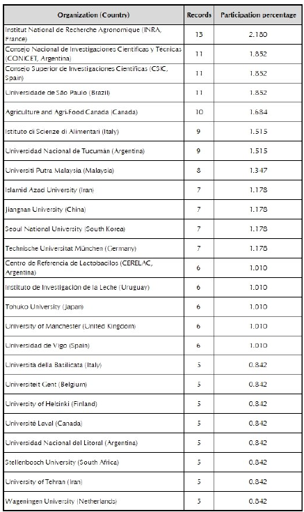 Table 1: Amount of publications of the 25 main organizations to which the research groups working on Lactobacillus belong between 2005-2016.