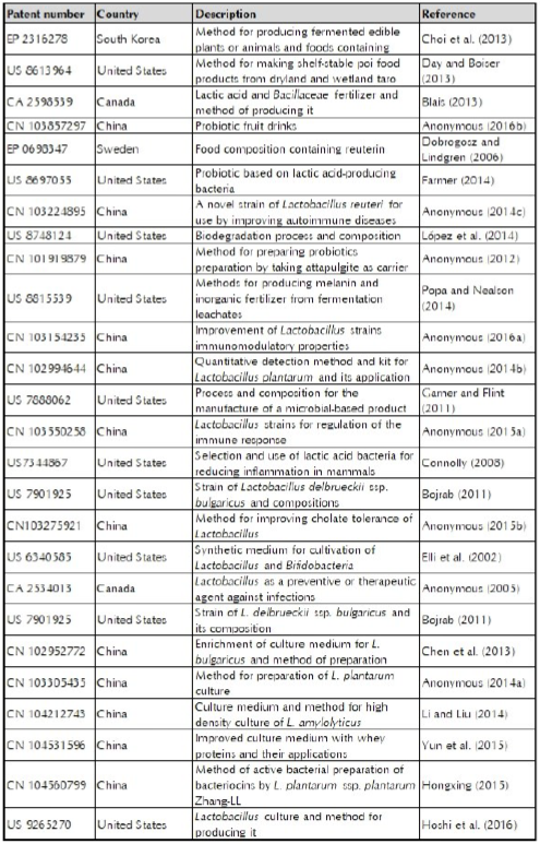 The literature reports an important amount of patents on new Lactobacillus strains, as well as processes for differentiating and quantifying lactic bacteria in some natural products, the composition and enrichment of media for their cultivation, and processes for producing, characterizing and applying products with probiotic properties obtained from Lactobacillus, among others. Table 2 presents the list of patents found in the last decade (from 2005 to August 2016 as a reference period for the analysis) regarding Lactobacillus.