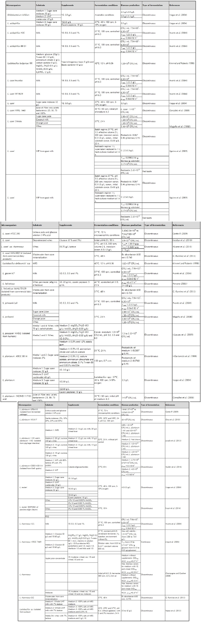 The culture media and main fermentation conditions for production of the main Lactobacillus species used for production of probiotics, starter cultures, and bacteriocins, are shown in table 3 (organized alphabetically by species name followed by the year of publication). Among the most individually studied Lactobacillus or a mixture of them, isolated from natural substrates, the following species should be highlighted for their probiotic and biopreservation activities: L. acidophilus, L. casei, L. delbruecki, L. plantarum, L. helveticus, L. rhamnosus, and Bifidobacterium bifidum.