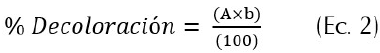 Donde: A equivale a los 50 mm del diámetro de la caja de Petri. B es el halo de decoloración en mm generado por el hongo, y 100 corresponde al 100 % o máximo de decoloración a obtener bajo las condiciones del ensayo que fue equivalente a 50 mm.