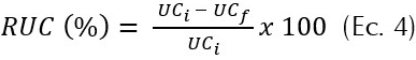 Donde: RUC es remoción de unidades de color en porcentaje. UCi son las unidades de color iniciales. UCf son las unidades de color finales (Fernádez et al., 2015).