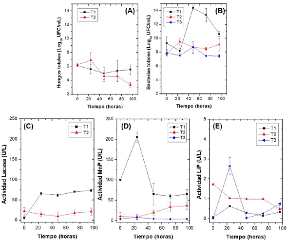 En la Figura 3 se presentan los recuentos expresados como Log10 de UFC/mL para los hongos y las bacterias. En el T1 el recuento de hongos osciló entre 4.0-7.0 unidades logarítmicas, siendo más bajos que los obtenidos con las bacterias (Figura 3A). Lo que podría atribuirse a la menor velocidad de crecimiento que tienen los hongos, en especial la cepa de T. versicolor la cual al ser cultivada en agar salvado de trigo tuvo una velocidad de 3.3 mm/d siendo 4 veces menor que la de P. ostreatus (12.5 mm/d) (datos no mostrados). En relación con los recuentos de bacterias en T1 oscilaron entre 4.0 y 14.0 unidades logarítmicas, evidenciando un crecimiento exponencial hasta las 48 horas, posteriormente las poblaciones descendieron hasta finalizar en 10.0 unidades logarítmicas (Figura 3B). Los recuentos de bacterias más elevados se relacionaron con la mayor velocidad de crecimiento y tiempos de duplicación más cortos. Por otro lado, las poblaciones de bacterias fueron más altas en T1 que en T3, demostrando que se requiere de la presencia de los hongos ligninolíticos para que se favorezca el crecimiento de las bacterias y los intermediarios producidos por los hongos fueron asimilados con mayor facilidad que los colorantes iniciales.