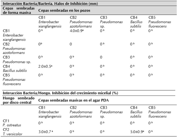 Al analizar los resultados de enfrentamiento bacteria/ hongo se observó que las cepas CB1 y CB4 solamente generaron una inhibición en el crecimiento micelial del 3.0 % y 5.0 % sobre T. versicolor a los 8 días de evaluación. P. ostreatus no fue inhibido por ninguna de las bacterias obteniendo porcentajes del 0 % (Tabla 1). Los porcentajes obtenidos fueron bajos determinando que los dos hongos podrían unirse a las cinco bacterias.
